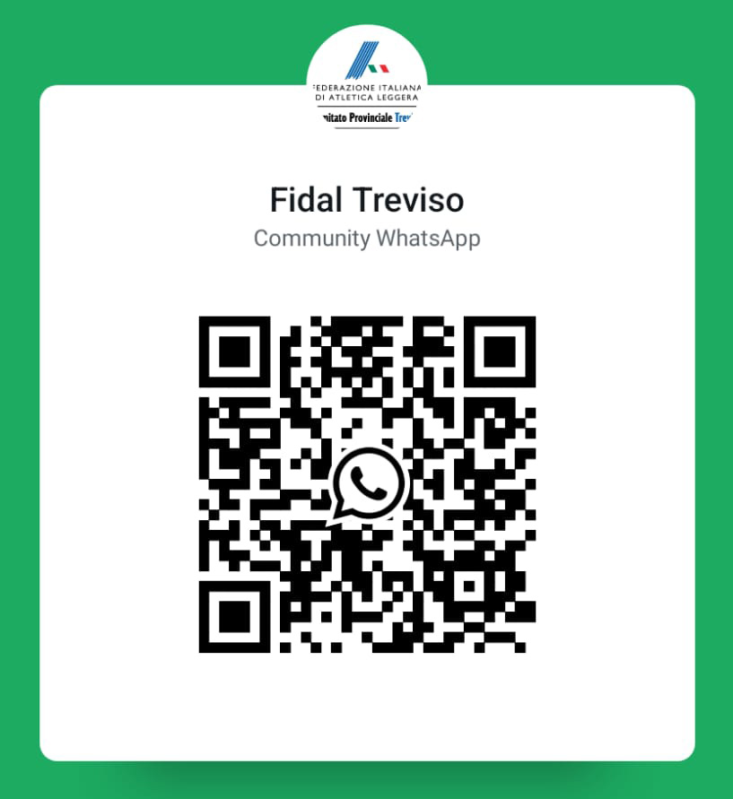 E’ attiva la nuova community Whatsapp di Fidal Treviso. E’ possibile unirsi al seguente link (https://chat.whatsapp.com/JZ6VLRRkhRbIzc4OolAHYn) o al qrcode sottostante.